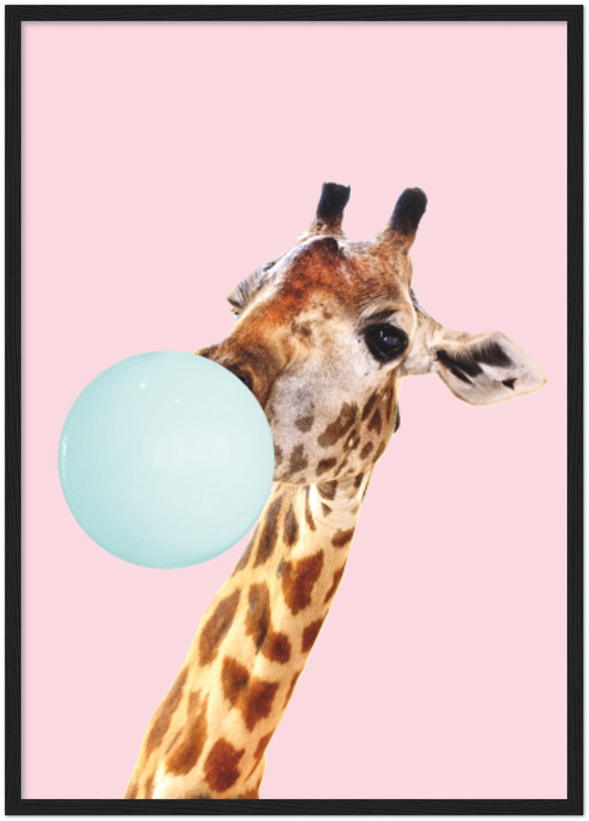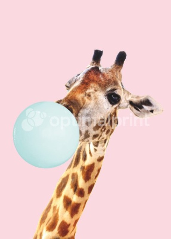 Simpatico poster che mostra la testa di una giraffa che crea un pallone con una gomma da masticare blu, su uno sfondo rosa. Un'illustrazione carina che si adatterà perfettamente alla cameretta di ogni bambino. Grazie ai colori allegri, è facile combinare questa stampa con altri pastelli luminosi per creare una divertente galleria da parete.